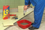 Размер зубцов должен быть примерно на одну единицу меньше, чем толщина самой плитки. Так, для кафеля толщиной 5 мм данный показатель должен составлять 4 мм. После того как клей нанесен, укладывают плитку, которая должна быть утоплена в него на глубину 3-5 мм. Желательно, чтобы раствор заполнил шов не более чем на половину его глубины и осталось место для затирки. Плитки выравнивают резиновой киянкой по высоте. Ровность укладки проверяют уровнем. Следите за тем, чтобы в клеевом слое не образовывались пустоты. Чтобы проверить это, периодически снимайте наугад одну из еще не застывших плиток и осматривайте ее с обратной стороны. Так вы сможете убедиться, что клеящий раствор распределен равномерно по всей поверхности. После завершения укладки очередного ряда удаляют излишки клеевой массы, выступившей сбоку от его края. От лишнего клея также очищают и швы. Делать это удобнее деревянной палочкой или влажной губкой, смоченной в растворителе. Данную процедуру нельзя откладывать на следующий день, иначе клей успеет схватиться, оптимальный вариант избавиться от лишнего клея спустя 4~5 часов после укладки плитки. 2010-09-26